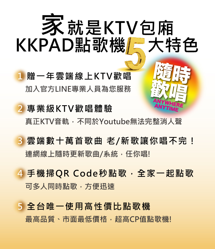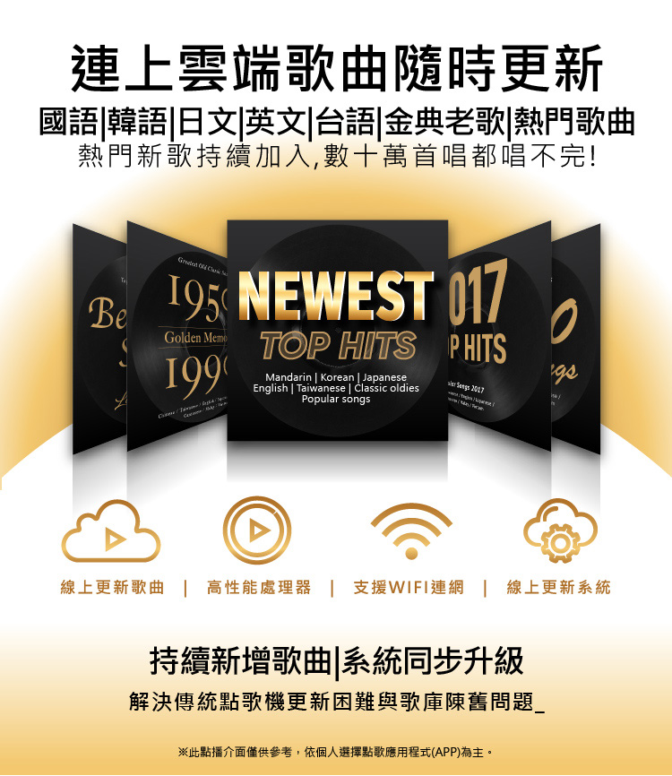 - 雲端數十萬首歌曲,連網線上隨時更新歌曲,老/新歌任你唱!