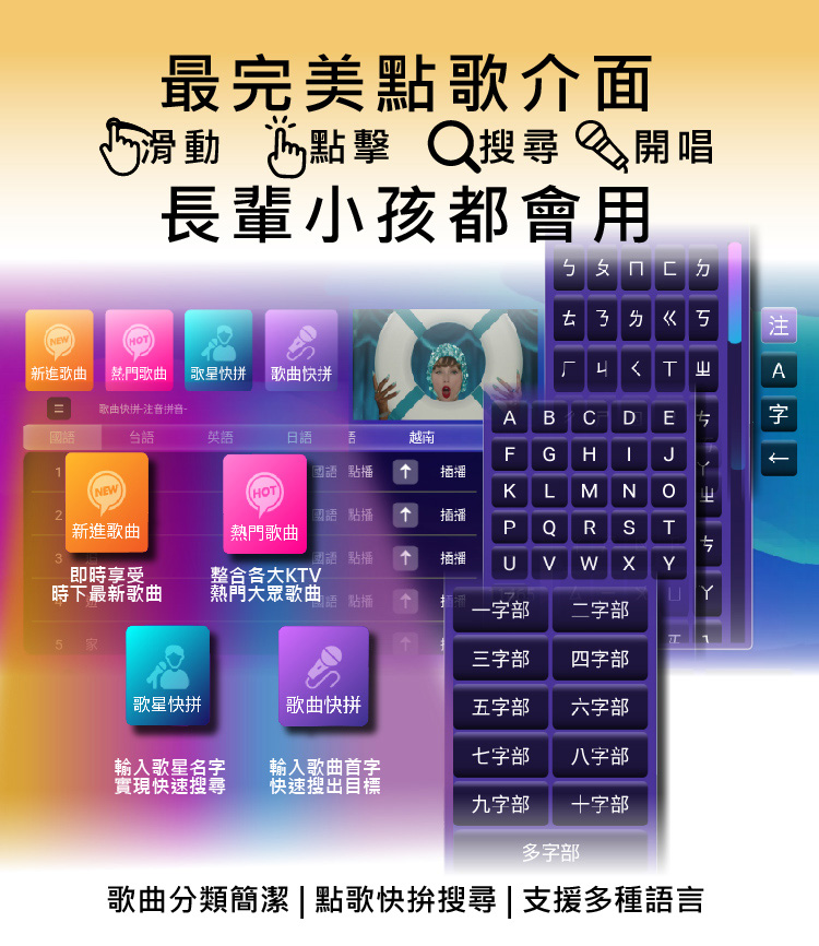 - 國語|韓語|日文|英文|台語|金典老歌|熱門歌曲,數十萬首唱都唱不完!