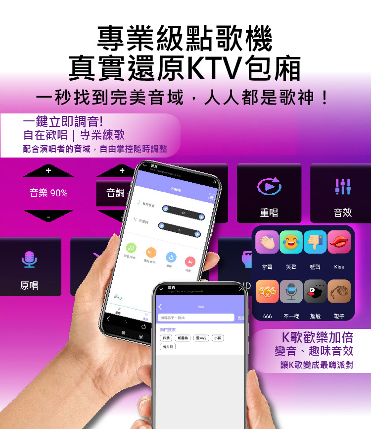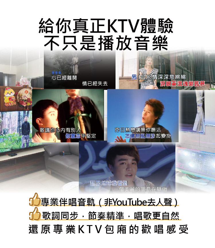 - 專業級KTV歡唱體驗,真正KTV音軌,不同於Youtube無法完整消人聲