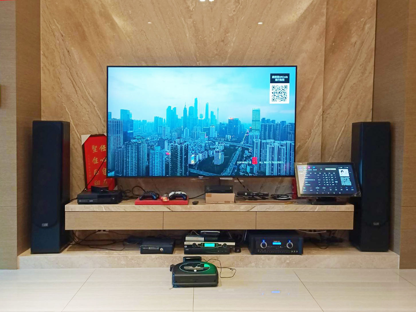 KKPAD 21.5吋安卓觸控屏點歌機/伴唱機(短腳架)+AU-25專業200頻無線麥克風+G&M X1頂級卡拉OK綜合擴大機+G&M FSJ128卡拉OK專業落地型喇叭【坪數】約10~15坪